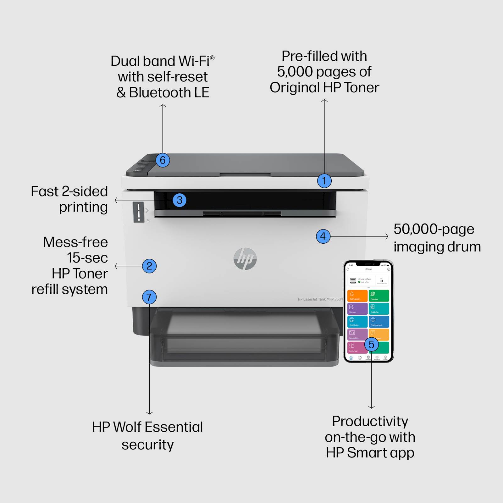 S HP-jevo najnovejšo revolucionarno tehnologijo zmanjšajte prekinitve dela. Visoko zmogljivi brezžični večnamenski tiskalnik z možnostjo ponovnega polnjenja, s priloženim tonerjem, ki omogoča natis do 5.000 strani. Zagotovite si visoko kakovost tiskanja brez kompromisov in prihranite do 60 % pri stroških za toner HP.